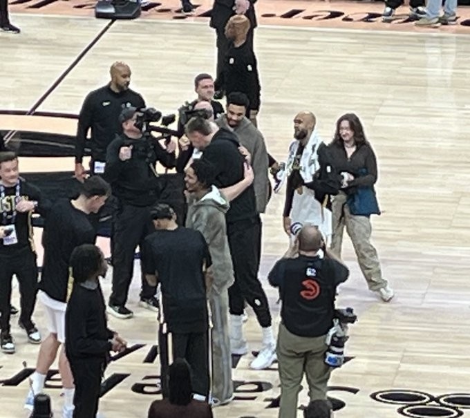 NBA常规赛,凯尔特人客场132-106大胜老鹰。比赛结束后,绿军冠军成员、现老鹰中锋波尔津吉斯(本场因伤没有出战)拥抱了豪泽(本场命中10记三分),并与塔图姆、怀特寒暄。...