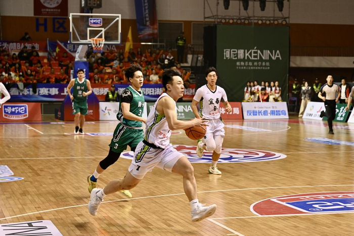 在与赣州队的对战中,宜春队球员面对防守从容不惧,强硬上篮。